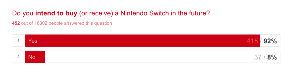 - Of those without a Switch, the majority (92%) do intend to buy (or receive) one at some point in the future. Of course, this is largely an expected response from such an enquiring audience.