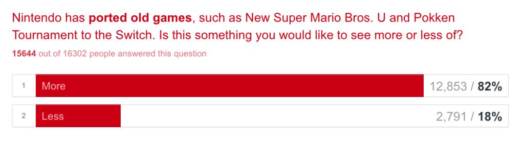 Last year, I asked whether folks wanted to see more old ports from Nintendo, and around 78% of respondents said yes. Well, this year, attitudes to ports on the Switch seem to have improved slightly, as that number now lies at 82%.