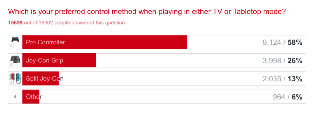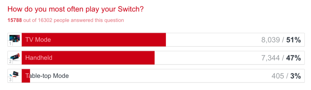 First up, I wanted to know how people play their Switch, was it docked, handheld or even table-top? Last year I only gave the option for docked (TV) or handheld. After some feedback this year I also included Table-top mode, which made sense considering it’s an official play-style which Nintendo often call out. Here’s the results on how people play: