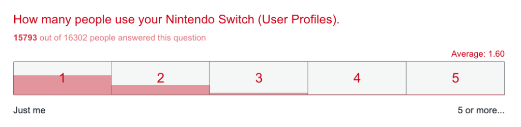 I rounded out this section of questions by asking how many people use each Nintendo Switch. It turns out for most people it’s a solo affair.