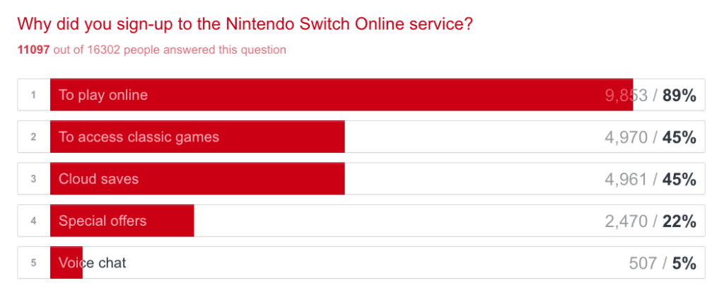 It’s of little surprise to me to see such low importance placed on voice chat here - I think most Switch owners have given up on Nintendo providing a decent voice chat solution for now. 95% of respondents said they don’t use Nintendo’s voice chat app. The survey showed that most people will go to Discord when they want to chat.