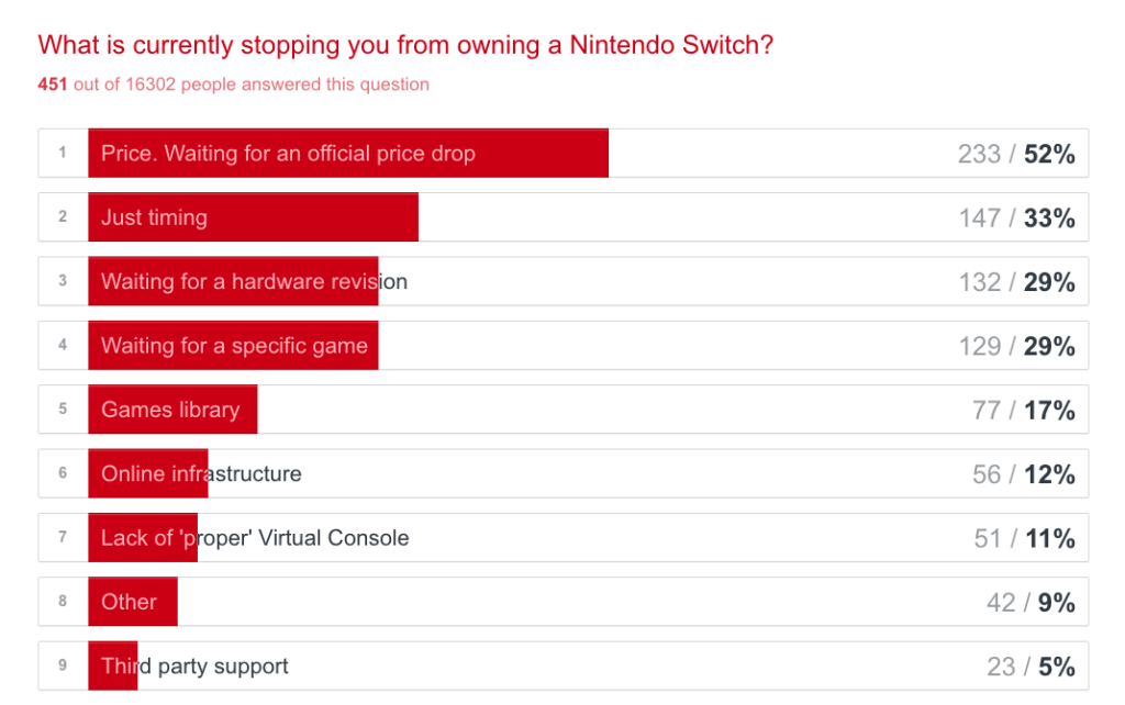 - Over 50% of those intending to get a Switch at some point said they’re waiting for an official price drop.