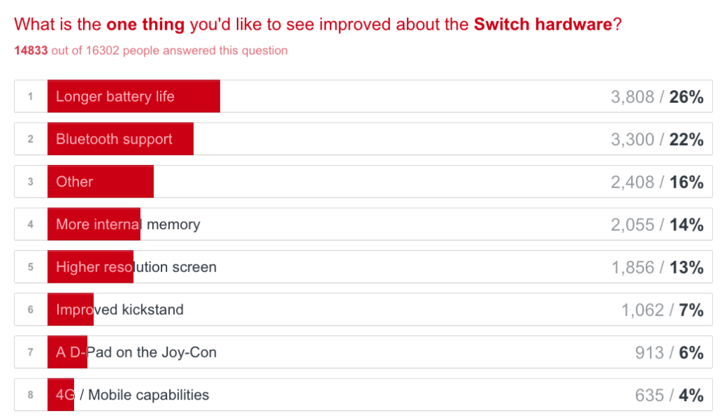 This last set of data is the area of unknowns. I asked a bunch of questions on games people want to see, and what they think about future Switch revisions.