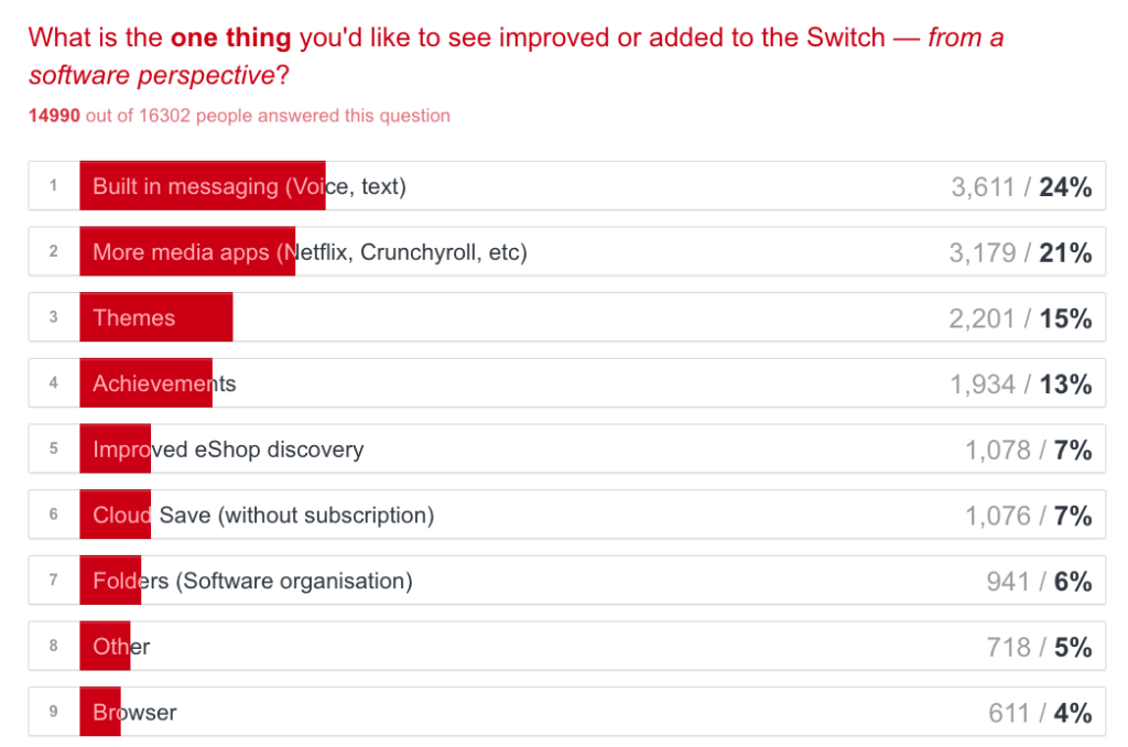 As the above data shows, people aren’t too fussed about a browser on the Switch - I forgot to include this as an option last year, but it didn’t get much support this year anyway. 🤷♂️