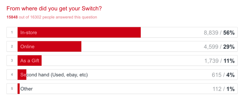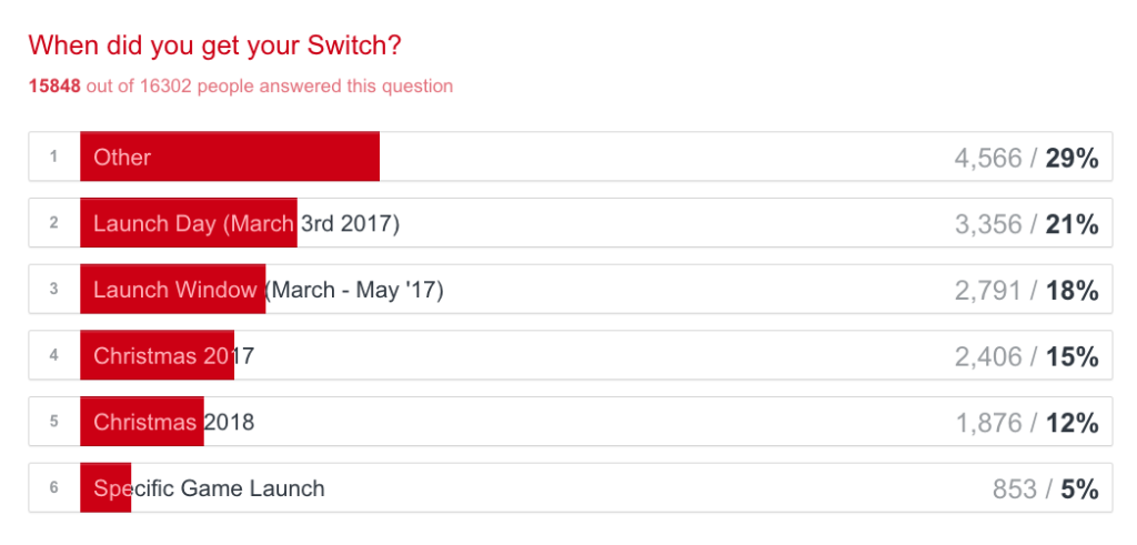 Next, I moved on to asking questions of those with a Switch (around 15,800 respondents). First up was finding out when they got their Switch and where from.