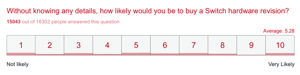 Moving on, I asked straight up, how likely respondents would be to buy a revised Switch without knowing any details. There have been plenty of rumours suggesting we would be getting new Switch hardware, possibly even this year, so I wanted to do a little test on how folks may respond to that.