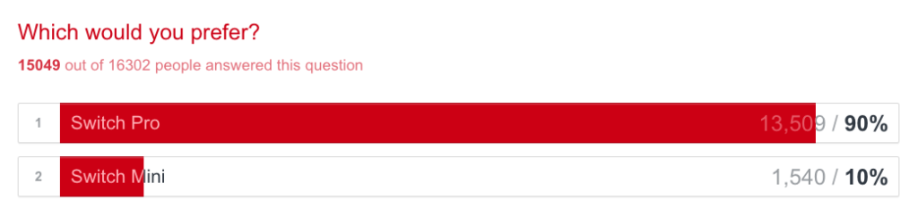 90% want a Pro. This response doesn’t come as much surprise really - those filling out this question are Switch users already who can no doubt easily imagine the benefits an improved Pro machine may offer, over what a simplified Mini may bring. The Mini may be compromise for different price points, so those already with a Switch are more likely to upgrade I reckon.