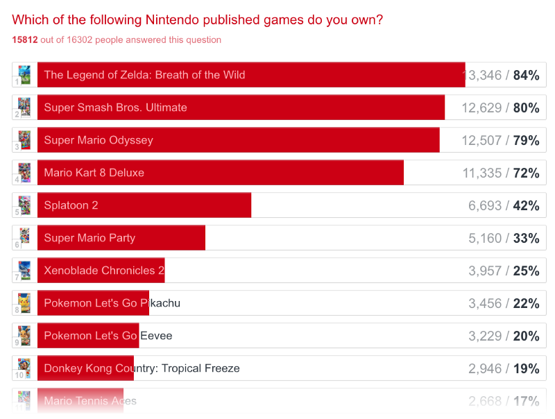 - When asked about which first-party published Nintendo games people owned, over 80% said they had The Legend of Zelda: Breath of the Wild and Super Smash Bros. Ultimate.