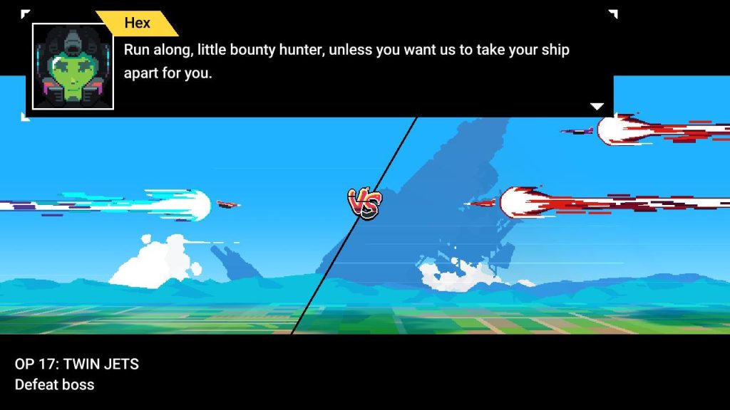 Now, if you do find yourself up against a particularly tricky level then you can change your loadout. You unlock new abilities as you progress, and switching them out is simple enough to do. It’s worth experimenting here, as from time to time you will find yourself up against an enemy type that requires mixing up your arsenal. You’ll want to conduct a bit of trial and error loadout testing when taking on the towering big bosses. They’ll assault your jet with new techniques, and you’ll want to figure out the best way to counter them.