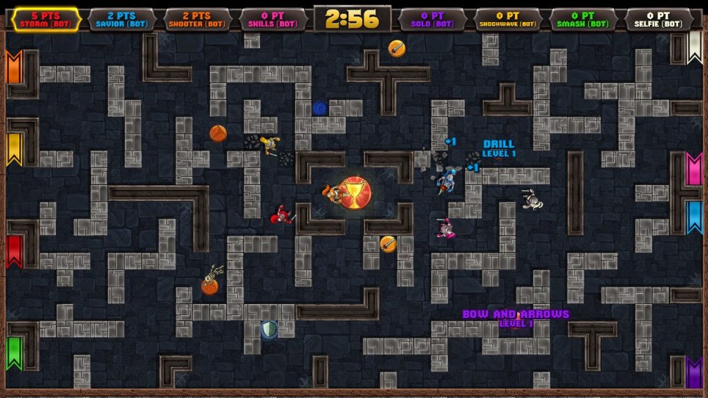 Getting the win in one of the 13 modes is made possible due to a fun array of weapons, whether that’s a basic sword, snappy crossbow, or lethal laser. There is a fun variety of options here, and its a blast to mess around with each and see which works best in each situation. The Ripper, which chucks out a rotating spiky disc, is a personal fave (oh and the Boomerang is underrated). Power-ups show up from time to time and can make you faster, give you a shield, offer you a horse to ride around on, or even give you a powerful but lethal Kamikaze attack.